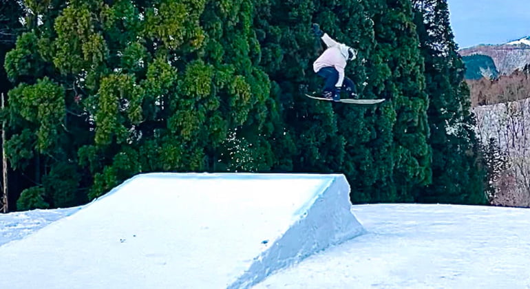 堀島行真選手・古川亜希子さんがスノーパークのキッカーやジブアイテムで飛ぶ、