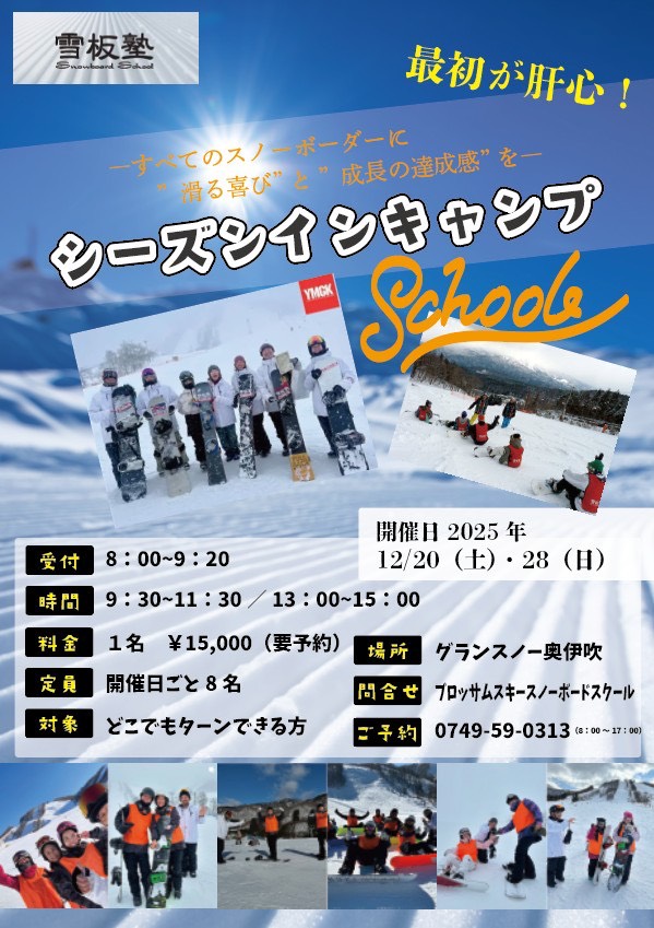12月20日(土)、28日(日)にスノーボードスクールの「シーズンインキャンプ」を初開催!!