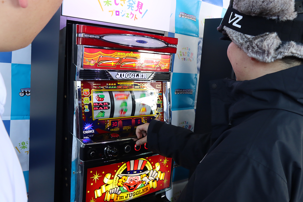 内 容:「パチスロ楽しさ発見プロジェクト」として「ジャグラーのスロットマシン」でプレイして遊べます。(お一人様1回まで)